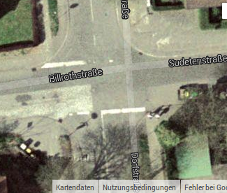 Das heißt, daß zum Zeitpunkt des Satellitenfotos (wahrscheinlich 2007 oder älter) keineswegs eine rechts-vor-links-Regel galt, sondern die Billrothstr eine Vorfahrtsstraße war.