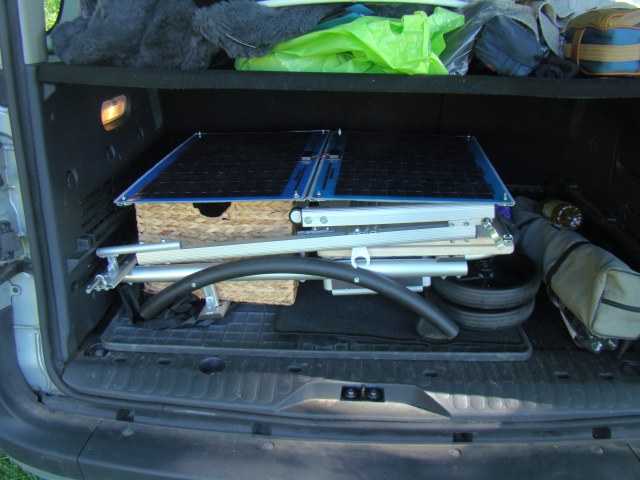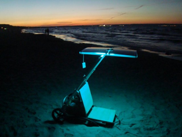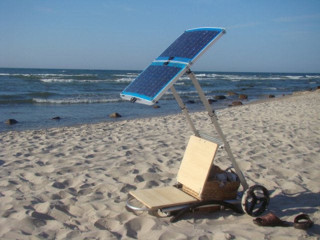 Das blau beleuchtete Nachtbild drängt einen weiteren Verwendungszweck auf: Als Höhensonne aufgerüstet kann der Tourist mit wenig Zeit auch nachts bräunen und so in kürzester Zeit den nötigen Urlaubslook zum Nachbarn neidisch machen erzeugen. :lol: Im Ernst: Schick und coole Idee und da ist noch Potential drin! Die Variante mit Solarpanel auf einem Rad-Anhänger mit Box hat z.B. hier schon mal jemand gebaut: http://www.kapege.de/radeln/mono.txt?page=5