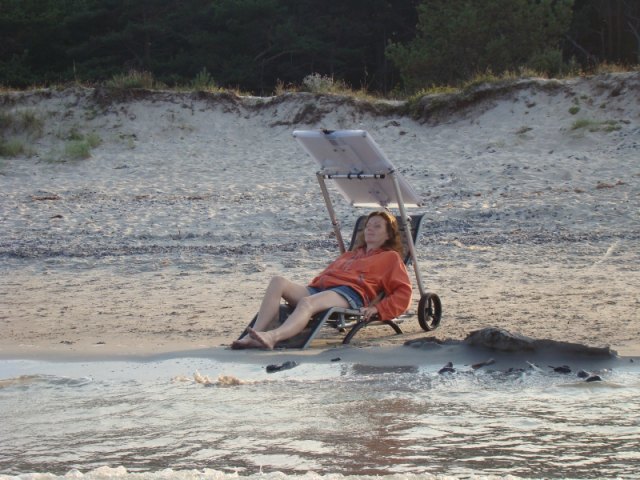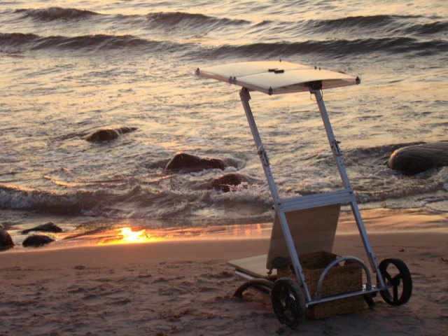 Man könnte natürlich größere Räder nehmen, dann übernehmen die am Strand die Tragfunktion., d.h. Gewicht Liege + Gewicht des Draufsitzenden.