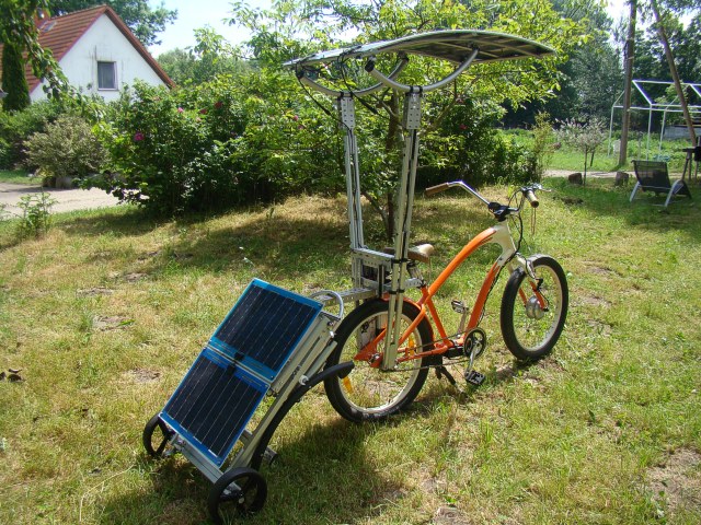 Auf den Bilder ist es natürlich doppeltgemoppelt beim Solarchopper, aber der stand gerade herum, außerdem kann der Fahrradakku zum Laden nie genug Saft bekommen.