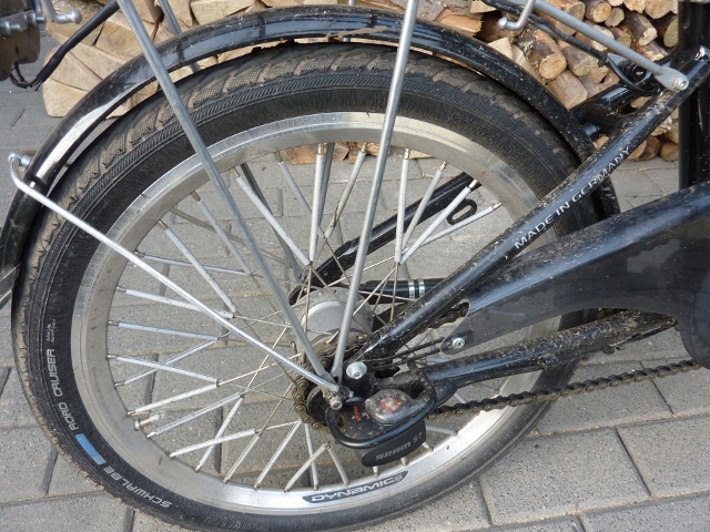 Ein neuer Shimano Nabendynamo fuer 15 Euro kam noch dazu. Ebenso neu sind die Speichen und Nippel, der Vorbau von Rose, der mittels einer Sattelstuetzenreduzierhuelse im abgesaegten Original-Vorbau klemmt, der Schaltdrehgriff und die Clickbox fuer die Spectro und die Teleskop-Sattelstuetze vom R&M Frog.