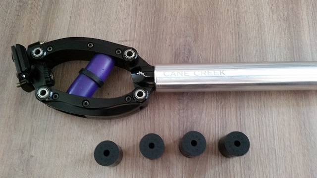 Der Härtegrad der Federung kann mit Hilfe von zwei sogenannten Elastomeren eingestellt werden. In der Sattelstütze sind zur Zeit zwei lilafarbene Elastomere eingebaut, die der Stärke sehr stark entsprechen (109 - 113 kg).