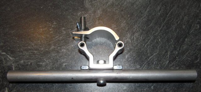 Das Haubtstück der Halter sind Trussaufnehmer (oder auch Halfcoupler) Schellen aus Aluminium die für Rohre von 32 bis 35 mm geeignet sind. Zu beziehen sind diese z.B. hier. An diesen Trussaufnehmer habe ich ein ca. 23cm Alurohr angeschraubt und dieses mit zwei zusätzlichen Schrauben gegen verdrehen gesichert. Ich habe dafür wieder das Material genutzt welches ich noch im Keller gefunden habe.
