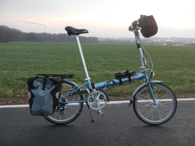Ich brauche jetzt noch irgendeinen kleinen Gurt, mit dem ich das gefaltete Rad am auseinanderklappen hindere, wenn ich es herumtrage, und eine Halterung für den Dahon CarryOn Cover Bag. Wobei der CarryOn Cover Bag natürlich genau so einen Gurt integriert hätte... Und ich hätte gerne ein Luftpumpe, also vermutlich dieses Sattelsützendings, denn was anderes bringe ich nicht sinnvoll unter, oder?