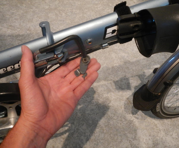 Dann habe ich noch den Sicherungsknubbel vom Rahmengelenk verloren. Die Schraube hat sich unbemerkt gelockert, und bei einem Schlagloch ist er dann ganz abgefallen. Ich konnte ihn leider erst aufsammeln, nachdem der nachfolgende Verkehr drübergefahren ist. D.h., das Ding ist kaputt.