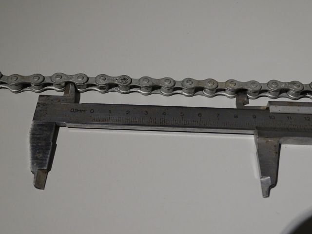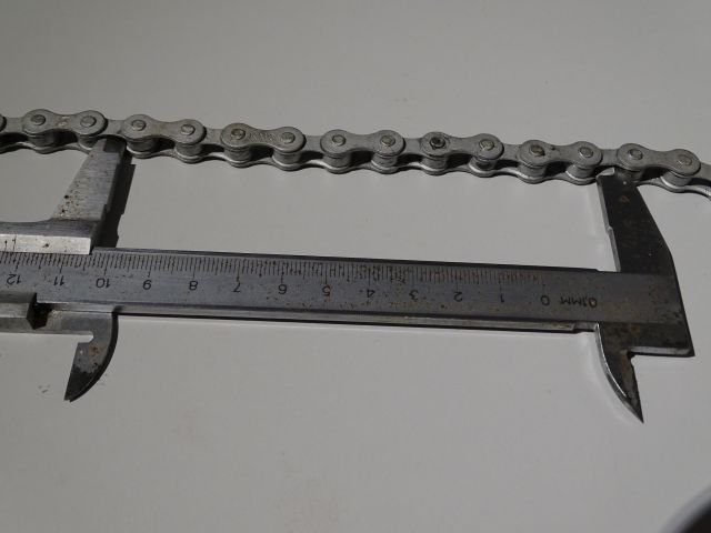 Aber selbst, wenn nur 9 Glieder gemessen worden wären, käme ich nur auf 12,7 x 9 [mm] = 114,3 [mm] im Neuzustand. Deshalb: Es wird die Länge von Achse zu Achse über 10 Teilungen (Vom "Nullten" Bolzen bis zum 10-ten) gemessen. Einige Ketten haben in der Bolzen-Achse kleine Bohrungen (Werkzeugaufnahme zum Vernieten ?), evtl durchgehende Bohrungen (Hohlnieten bei einer Leichtbau-Kette !) , da kann man mit dem Meßschieber direkt reinpicken, wenn nicht, macht man zwei Messungen am Außenradius und Innenradius der Bolzen und bildet den Mettelwert.