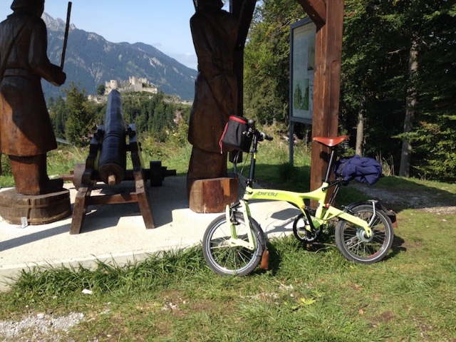 Wir aber fahren alpin. Ich habe noch nie ein Brompton in den Bergen gesehen.