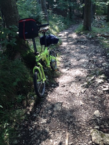 Ich habe natürlich auch ein Bergradl. Und natürlich fährt sich das Bergradl - sagt schon der Name - in den Bergen insgesamt besser als das Birdy. Die Reifen sind breiter und die Laufradgröße macht gewaltig was aus. Aber: Man kommt auch mit dem Birdy weit. Hoch nicht, aber runter. Hoch deshalb nicht, weil diese Nexus(?), jedenfalls diese Gänge, ich habe vergessen, wie viele es sind, ich glaube 8, nur leichte Anstiege erlaubt. Na gut, dann schieben wir halt. Bergab aber geht. Geht sehr gut.