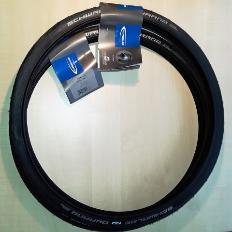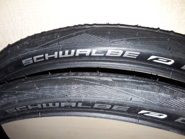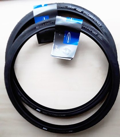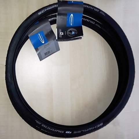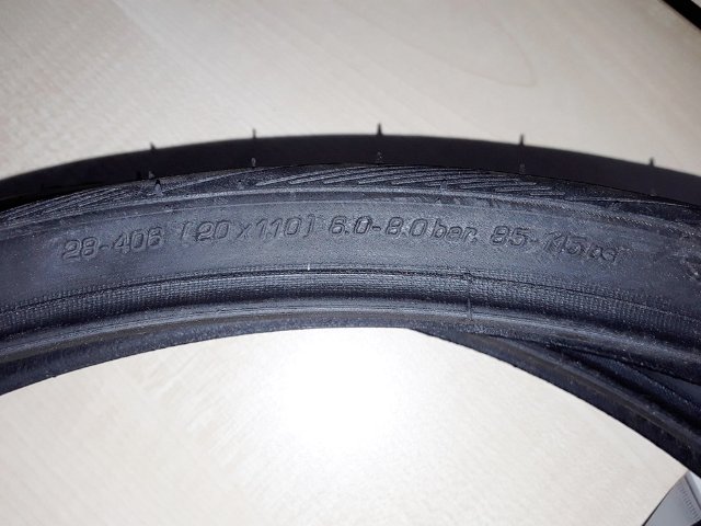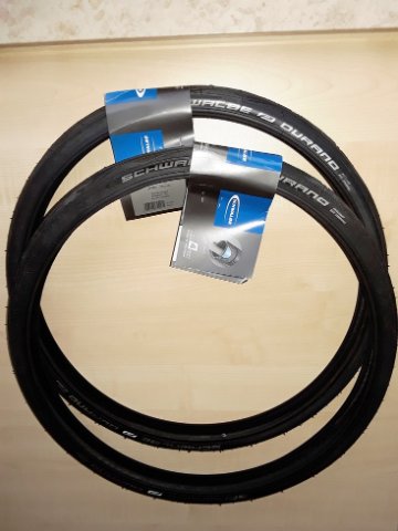 Die Rennreifen fürs Faltrad vom Marktführer Schwalbe mit Raceguard-Pannenschutz. Sie können bis 8 bar gepumpt werden, d.h. sie rollen sehr leicht und machen das Rad entsprechend schnell. Einer wiegt nur 240 g. Die Dimension ist 20 x 1,10 Zoll bzw. 28-406. Es sind Drahtreifen. Ich verkaufe auch noch zwei ebenso neue dazu passende Schwalbe-Schläuche, siehe meine anderen Anzeigen.
