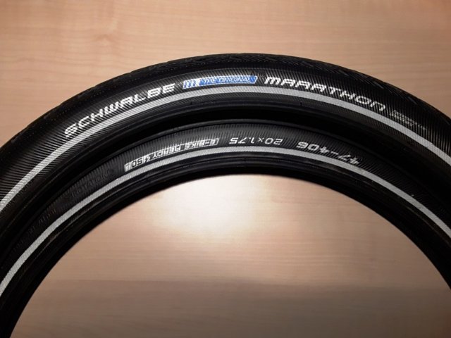 Über die Schwalbe Marathon muss man nicht viele Worte verlieren. Sie sind seit Jahren die Referenz bei Tourenreifen, denn sie kombinieren den legendären Green-Guard-Pannenschutz mit leichtem Lauf, hervorragendem Komfort und gutem Grip. Hier biete ich euch zwei Stück in der Dimension 20 x 1,75 Zoll bzw. 47-406. Es sind Drahtreifen, und sie können bis 5 bar (70 psi) gepumpt werden. An den Flanken haben sie Reflexstreifen. Ein nicht zu unterschätzendes Sicherheitsplus, gerade in der dunklen Jahreszeit. Ich verkaufe auch noch dazu passende Schwalbe-Schläuche!