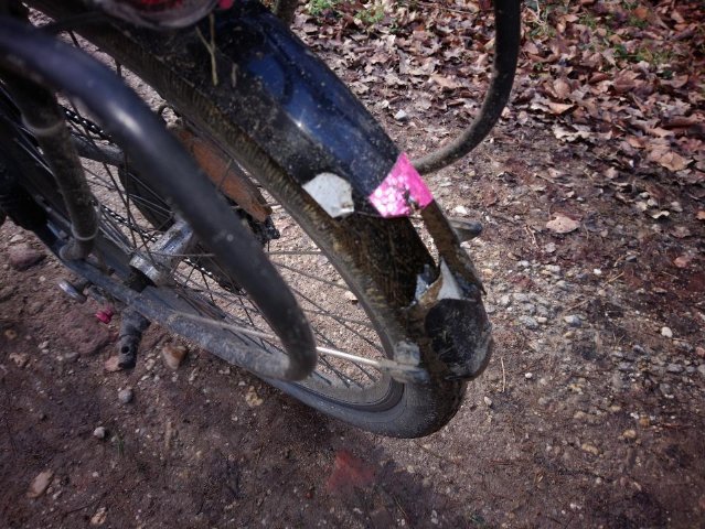 Gestern hat es mein hinteres "Schutzblech" zerfetzt. In der Dunkelheit musste ich wegen einsetzendem Regen meine Klamotten aus der Seitentasche holen. In der Eile habe ich nicht bemerkt, dass der Schultertragegurt aus seiner Klemmung am Gepäckträger rausgerutscht ist. Etwa einen Kilometer hab ich geschafft, bevor er sich dann zwischen Reifen und Blech verhedderte und das Hinterrad zum Blockieren brachte.