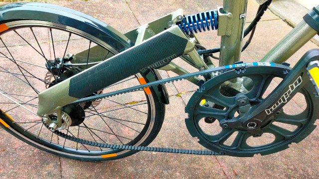 Zuerst einmal: Ketten-(Riemen-)linie ist kein Problem. Das vordere Riemenrad von Strida ist ziemlich breit. So breit, dass es beim Falten fast schon wieder im Weg ist. Und nein, der Riemen springt trotz fehlender Riemenspannung, nicht über. Die vordere Bremsscheibe musste ich auf den überdimensionierten 180 mm lassen. Macht aber nichts. Ob hydraulische Bremsen an einem Faltrad, das ja gerne mal liegt oder bei dem Teile auf dem Kopf stehen, die ideale Lösung sind, will ich mal dahingestellt lassen. Der Vorbesitzer hatte sie montiert, und ich habe sie gelassen. Sollte ich damit Probleme bekommen, würde ich sie auf mechanische Scheibenbremsen zurückrüsten.