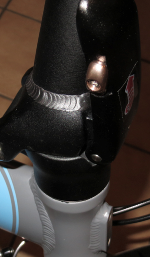 Anbei zwei Bilder. Das erste zeigt den Schnellspanner am Lenker (analog für den Spanner am Rahmen) und die goldene Sicherung. Beim zweiten Bild ist klar zu sehen, dass zwischen der Nase am Lenkerrahmen und diesem Sicherungssplint ein Abstand von 0,5 cm ist, und somit die Sicherung nie einrasten kann, ist das bei anderen auch so ?