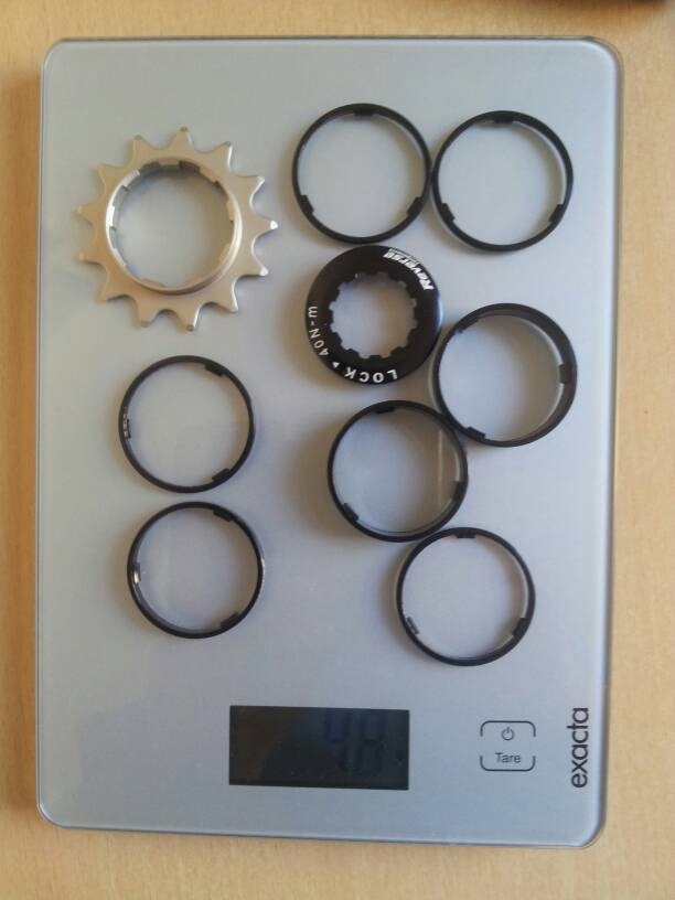 Hersteller "SHUN" hab ich ergoogelt als eine China-Firma, genauer: Shenzhen Shiduoli Hardware Co., Ltd. Besonderen Style hat das nicht, erfüllt aber den Zweck. Das TA Alize Blatt passte auch auf die Innenseite, so dass die Kettenlinie hoffenlich auch für die Alfine ok geht. Sieht auch brauchbar aus. Die Kettenblattschrauben sind jetzt nicht versenkt sonder liegen auf, kürzere waren aber nicht nötig. Eine Kettenblattschraube wiegt übrigens 6g, gibt da auch welche mit 2g, blieben also 5x4g=20g "Tuningpotenzial" für später. Wiegt so jetzt 811g, siehe Parts-on Scale-Bild.