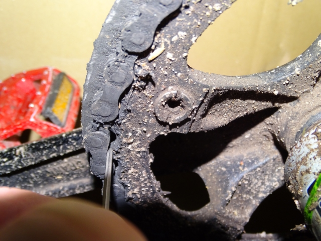 Meine alte Kette (Original, 1. Kette Dahon) nach ca. 6000km. Auch damit konnte ich noch fahren, allerdings traten seitliche Resonanzschwingungen auf. Längung etwa 2.5 Kettenglieder.