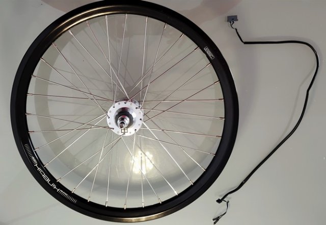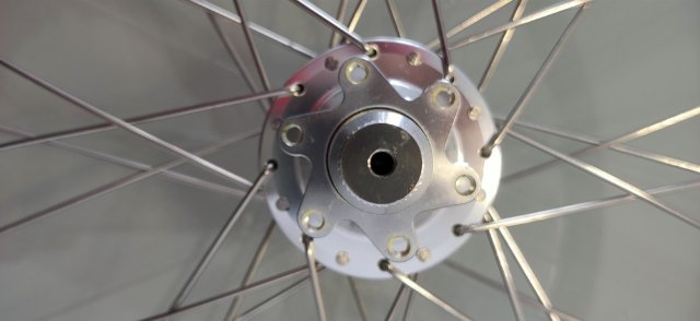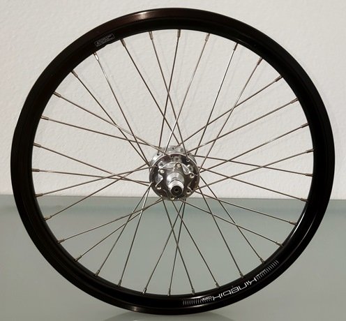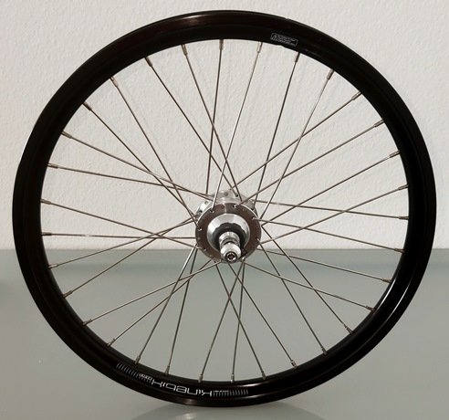 Ich verkaufe zwei gebrauchte Laufräder für Falträder in 20 Zoll (406). Hier geht es um das Vorderrad. Wie auf den Bildern ersichtlich ist die Felge schwarz. Es ist eine Kinetix-Comp-Hohlkammerfelge mit 32 Speichen. Die Felgeninnenbreite beträgt 17 mm, außen 22 mm. Das Felgenbett ist mit einem Hochdruckfelgenband ausgekleidet. Bremsflanken gibt es nicht, dafür eine Scheibenbremsaufnahme für den IS-2000-Standard mit 6 Schrauben. Die Speichen sind silberfarben. Die Nabe besteht aus einem Shutter-Precision-Dynamo SD-8, der 6 Volt und 3 Watt bringt. Er eignet sich für Felgen mit einem Durchmesser von 400 mm bis 535 mm. Die Einbaubreite beträgt 100 mm. Gewicht 993 g. Mit dazu gehören auch die Achse mit Befestigung durch eine 5-mm-Inbusschraube und das Anschlusskabel für den Dynamo.