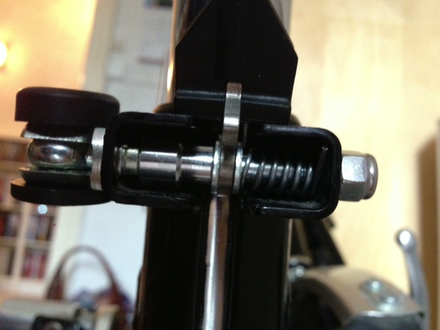 Ich habe auf einer französischen Seite im Netz eine Anleitung gefunden, in der die Feder und die Hülse getauscht wurden Das heisst, die Feder sitzt jetzt vón hinten gesehen links und die Hülse rechts. Ausserdem sind wohl zwei zusätzliche Unterlegscheiben eingelegt.