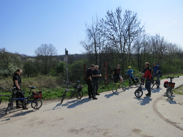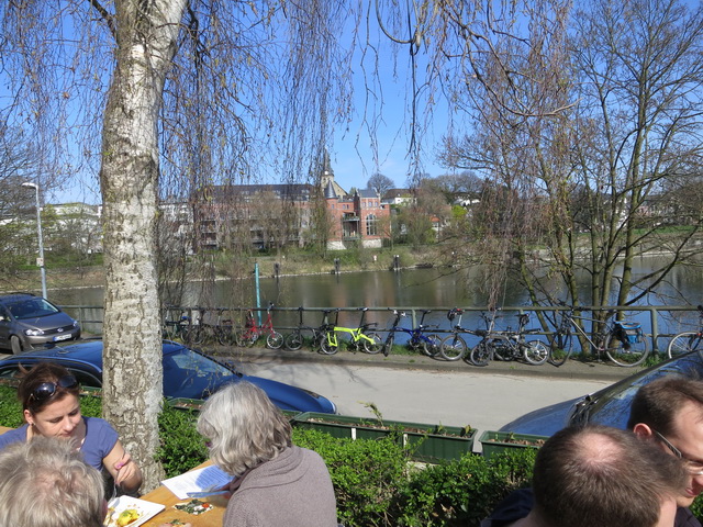 Hat den Riesenvorteil, dass man am Ende in einen Biergarten oder eine Eisdiele entschwinden kann, wo man die Räder im Blick hat. Und nicht in eine dunkle Kneipe mit Fußball auf der Großleinwand. (Hatten wir bei unserer allerersten Faltradtour im Spätherbst)