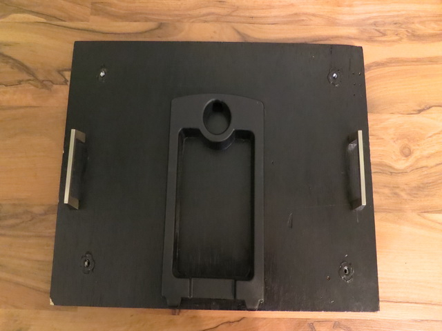 Statt Drahtkorb hab ich dann eine Sperrholzplatte genommen. Die ist genau so groß, wie die Bodenfläche vom Bauhaus Korb. An den Ecken sind Bohrungen mit einer Einschlagmutter auf der Rückseite. Die beiden Schrankgriffe sind zum Einhaken von Spanngurten und zum Tragen der Platte.