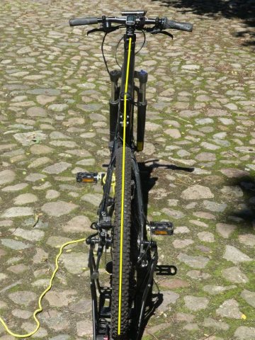 Als bei den Einstellereien extrem praktisch erweist sich der mitgeführte Prüfstand (Rackstand). Einfach das Rad auf den heruntergeklappten Gepäckträger stellen und Pedale, Hinterrrad, Schaltung usw. sind frei beweglich.