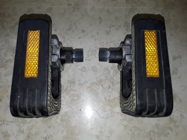Diese Pedale kann man einklappen. Das ist sehr praktisch, wenn man das Faltmaß des Faltrads verkleinern will, ohne die Pedale abnehmen zu müssen. Sie haben die vorgeschriebenen Reflektoren. Ursprünglich waren sie an meinem Dahon-Faltrad montiert. Mir waren aber Steckpedale lieber, so dass ich sie nicht mehr benötige und günstig abgebe. Das heißt, sie waren bereits in Gebrauch, was man ihnen auch ansieht (siehe Bilder), funktionieren aber einwandfrei. Die Achsen drehen sich sehr leicht, und der Klappmechanismus ist stabil und rastet sicher ein. Sie passen an alle Fahrräder mit Standard-Pedalgewinde.