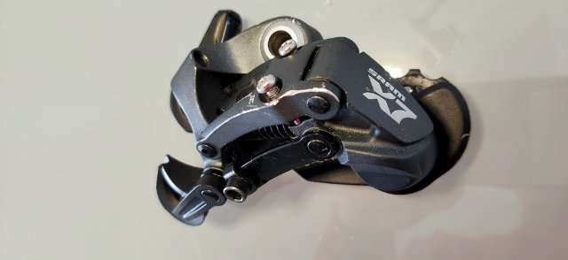 Das SRAM-Schaltwerk X7 kann bis zu neun Gänge schalten. Das größte Ritzel kann dabei bis zu 36 Zähne haben. Es funktioniert mit allen Trigger- und Drehgriffschaltern mit einem Betätigungsverhältnis (actuation ratio) von 1:1. Es ist die Version mit dem langen Käfig.