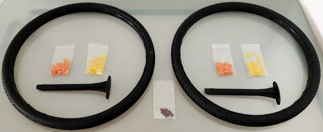 Der Nachteil soll nicht verschwiegen werden: Der Rollwiderstand ist etwas höher als bei hart gepumpten Luftreifen. Spielt aber in der Stadt weniger eine Rolle. Ich habe damit trotzdem Touren von 100 km und mehr an einem Tag gemacht. Komfort und Grip sind identisch. Hier bekommen sie zwei gebrauchte schwarze Tannus-Reifen in den Maßen 32-406 oder 20*1,25 Zoll für Falt-, BMX- und Kinderräder. Sie eignen sich für Felgen mit einer Innenbreite von 17 mm bis 20 mm. Montiert werden sie mit sogenannten Pins. Die 21,5 mm breiten stecken noch drin. 18,5 mm und 17,5 mm breite gebe ich mit dazu. Ebenso die beiden S-Tools und eine Anleitung. Pins in anderen Längen habe ich dummerweise weggeworfen, weil ich dachte, ich würde sie nicht mehr benötigen. Kann aber behilflich sein, welche zu bekommen. Eine Einbauanleitung gibt es hier:
