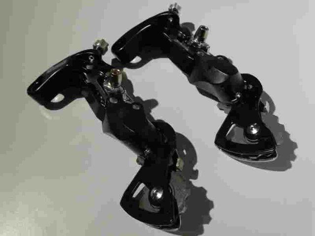 Beide haben einen Parallelogramm-Mechanismus aus gebogenem Blech mit einer Kunststoff-Abdeckung. Bei 1.0 ist zum Klemmen des Bowdenzugs eine normale Mutter M5 angebracht und in der Kunststoffabdeckung ist ein Schriftzug "SR SUNTOUR" eingeprägt. 2.0 hat eine "Inbus-Mutter" M5 zum Klemmen (so wie die Mutter an V-Brake-Bremsschuhen, nur kleiner). Die Einstellschraube für den Bowdenzug ist leicht unterschiedlich. Käfighalter bei beiden aus Kunststoff.