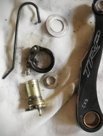 Jetzt habe ich die V-Brakes aber erstmal komplett demontiert, gesäubert und frisch geschmiert wieder eingesetzt. Die waren ziemlich schmutzig und das Fett war schon wachsartig.