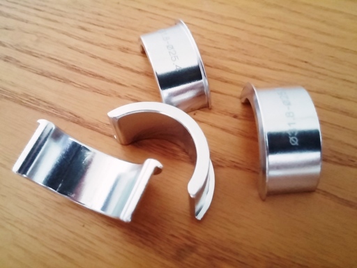 Falls Euer Vorbau 31,8 mm Durchmesser hat (1¼ Zoll), der perfekte Lenker aber nur in 25,4 mm (1 Zoll) erhältlich ist, hilft dieser Adapter. Er ist aus Aluminium und besteht aus vier silbernen Halbschalen. Ich empfehle ihn nur für gerade oder leicht gebogene Lenker (flat bars) Die Breite eines Teils beträgt 14 mm und das Gewicht von allen vieren 21 g. Der Adapter war nur einmal kurz montiert, was leichte Spuren hinterlassen hat, wurde aber nie gefahren, darf also als neu gelten.